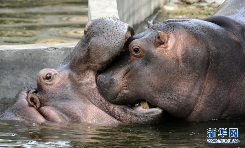 北京動(dòng)物園河馬館內(nèi)的河馬在嬉戲(6月28日攝)。
