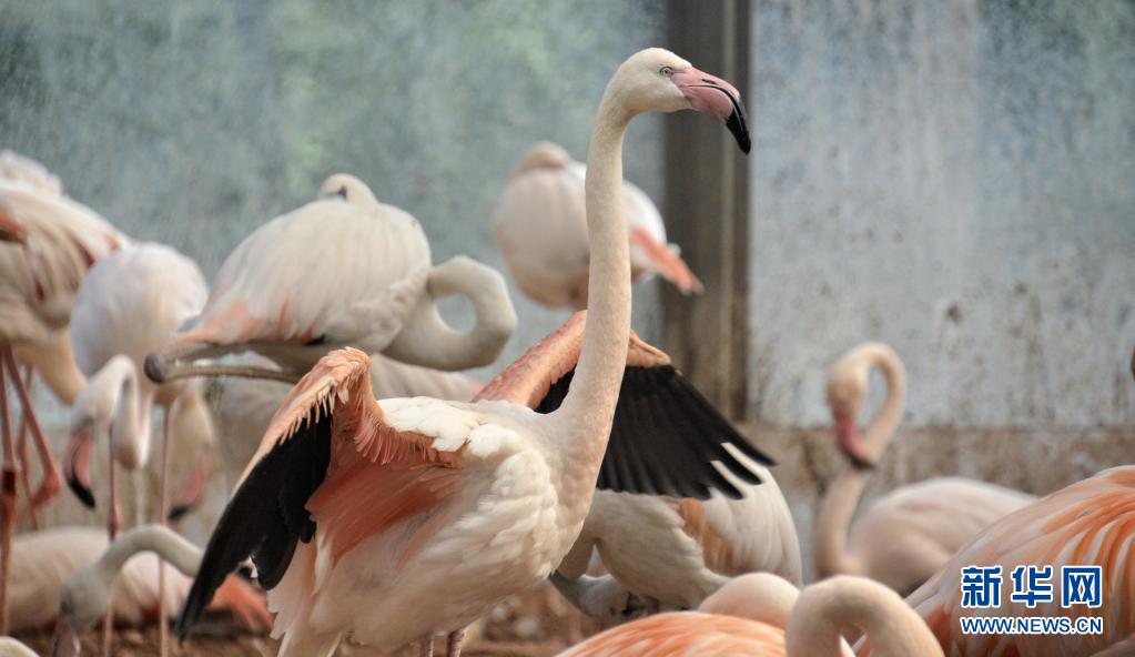 北京動(dòng)物園內(nèi)的火烈鳥(niǎo)在室內(nèi)乘涼(6月28日攝)。