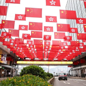 6月29日,在香港尖沙咀一條街上,中華人民共和國國旗和香港特別行政區(qū)區(qū)旗一起迎風飄揚。