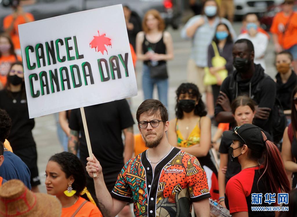 當天是加拿大日,上千名抗議者在溫哥華集會,悼念加拿大在強制“同化”原住民過程中遭到殘害的兒童,呼吁取消加拿大日的慶?;顒印?/p>
