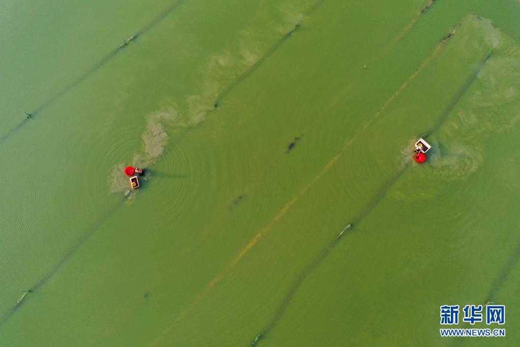7月5日,在湖南省永州市道縣蚣壩鎮(zhèn)洲背村,村民在收獲小龍蝦(無人機照片)。
