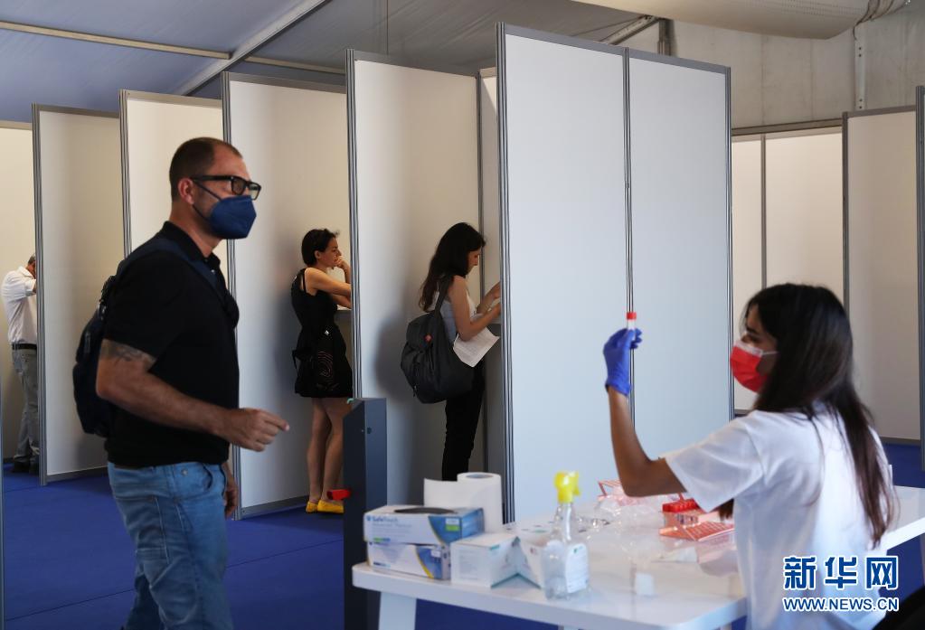 7月5日,在法國戛納為電影節(jié)注冊人員設(shè)立的新冠病毒檢測點(diǎn),工作人員收集檢測樣本。