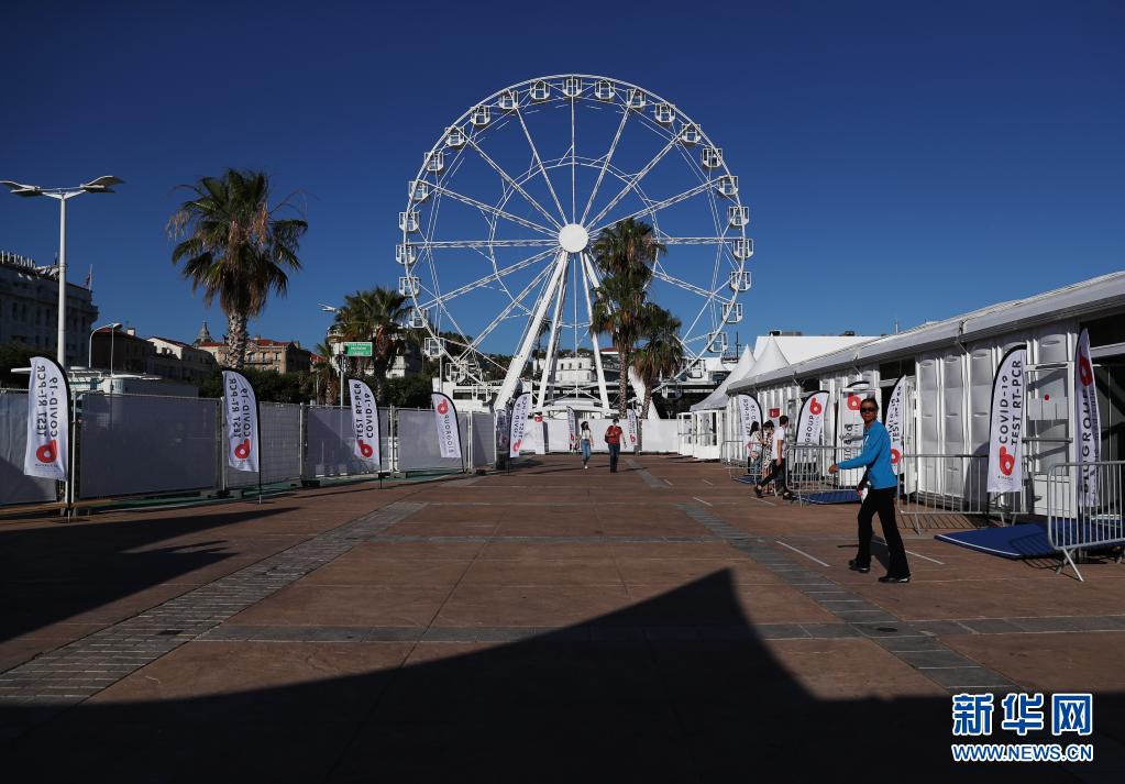 這是7月5日在法國戛納拍攝的為電影節(jié)注冊人員設(shè)立的新冠病毒檢測點。