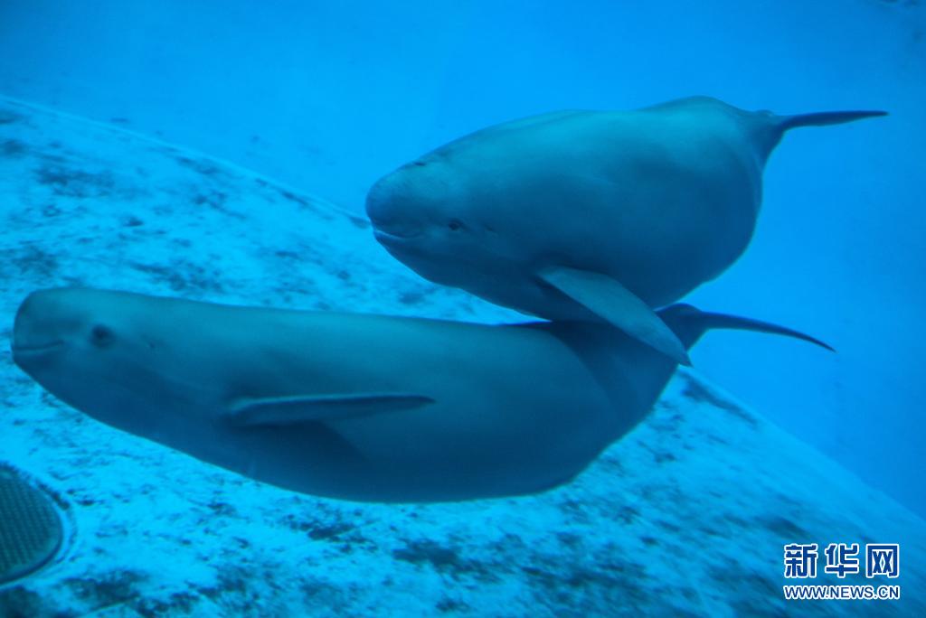 7月5日,江豚媽媽洋洋和小江豚YYC在水中游動。新華社記者肖藝九攝