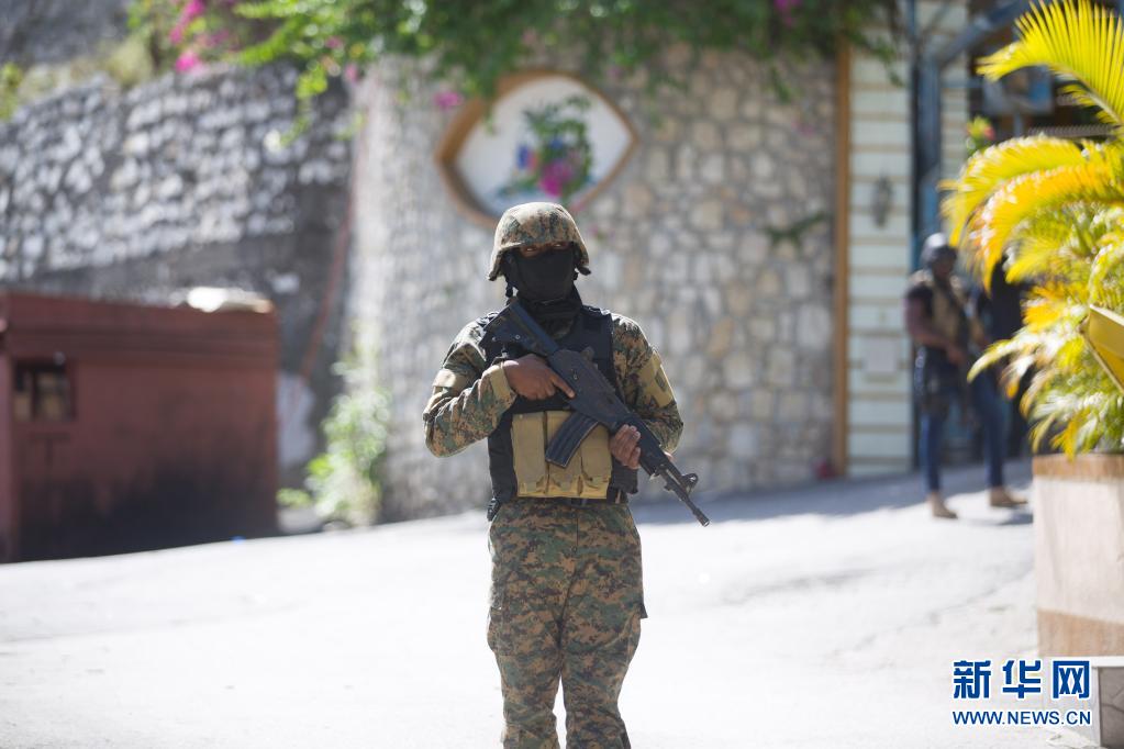 7月7日,在海地太子港,一名士兵在海地總統(tǒng)莫伊茲的住所旁執(zhí)勤。