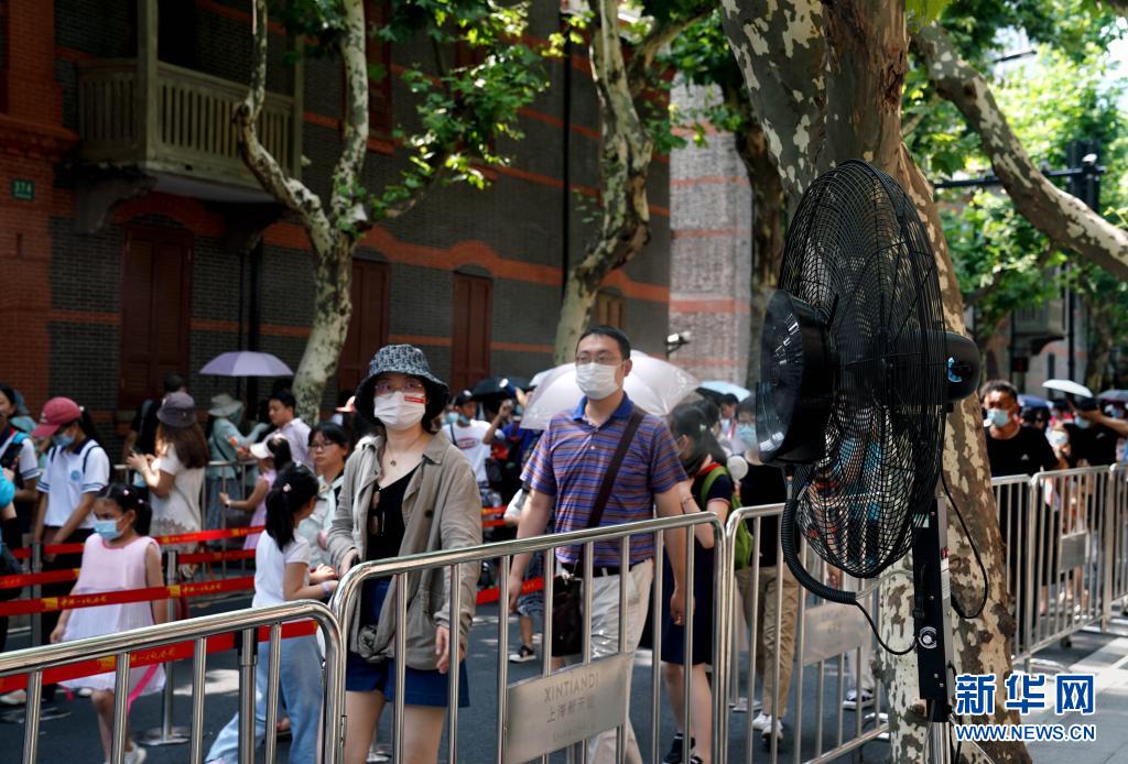 中共一大紀念館在觀眾排隊通道設置多個噴霧風扇用于降溫(7月11日攝)。