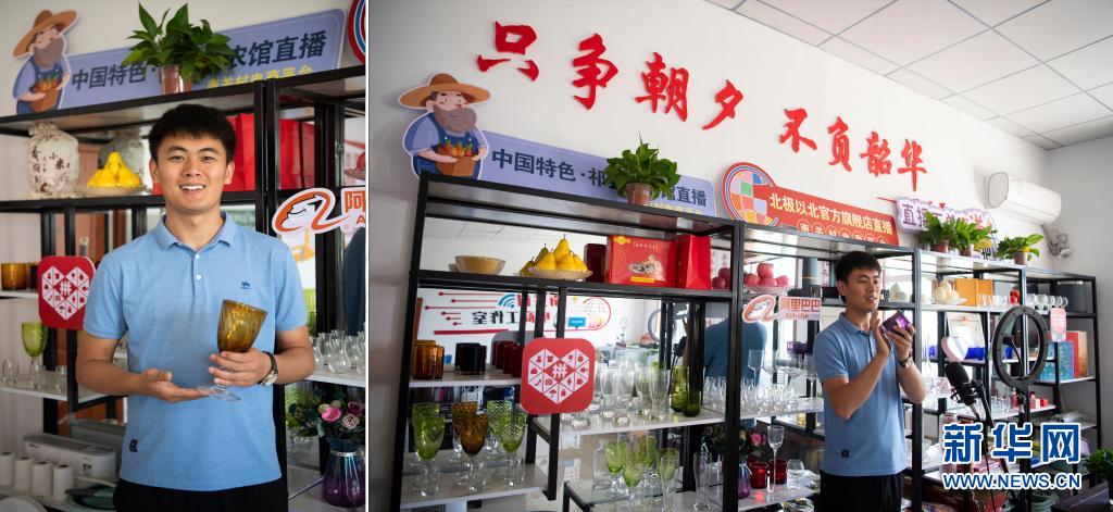 拼版照片:左圖為胡翔宇展示山西省祁縣產(chǎn)的玻璃杯;右圖為胡翔宇通過網(wǎng)絡(luò)直播介紹玻璃杯(7月6日攝)。今年31歲的胡翔宇是祁縣南關(guān)村人,在從事農(nóng)村電商之前,他做過工程設(shè)計(jì)、當(dāng)過教師。2019年,胡翔宇回到家鄉(xiāng),開始從事祁縣特產(chǎn)和特色農(nóng)產(chǎn)品的銷售。2021年,南關(guān)村成立了電商平臺(tái),為返鄉(xiāng)青年提供創(chuàng)業(yè)服務(wù)和便利條件,胡翔宇和他的團(tuán)隊(duì)第一時(shí)間入駐。為拓寬銷售渠道,他開始嘗試直播帶貨,1個(gè)多月的時(shí)間,粉絲量已經(jīng)突破3000余人。