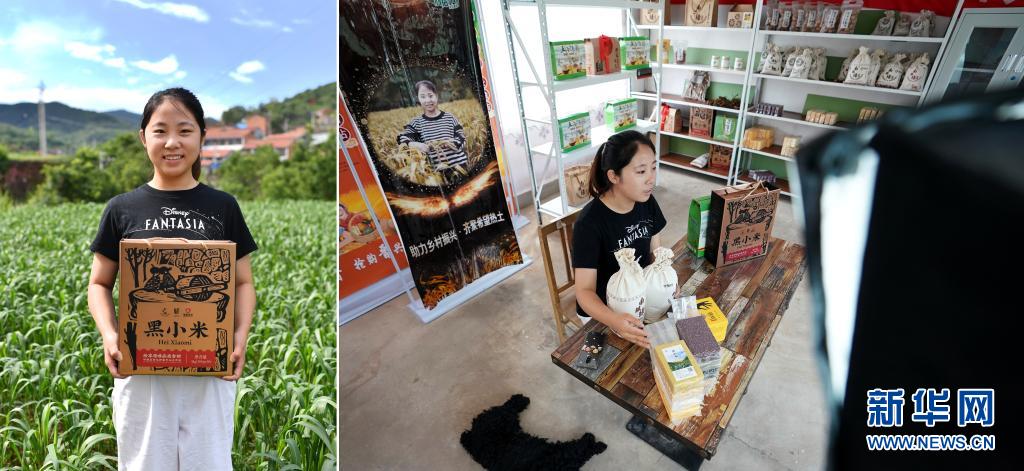 拼版照片:左圖為王亞妮在山西省平順縣南坡村展示包裝好的小米;右圖為王亞妮通過網(wǎng)絡(luò)直播介紹合作社的小米、玉米糝、豆類等農(nóng)產(chǎn)品(7月9日攝)。今年26歲的王亞妮曾是一所學(xué)校的輔導(dǎo)員,2019年回到家鄉(xiāng)創(chuàng)業(yè)。身為農(nóng)民的孩子,王亞妮懂得父輩的辛苦和無奈,勞作一年到收獲季節(jié),農(nóng)產(chǎn)品卻賣不上好價(jià)錢。她一直想改變這種現(xiàn)狀,互聯(lián)網(wǎng)讓她看到了希望。通過電商銷售,合作社的農(nóng)產(chǎn)品銷往了全國各地。