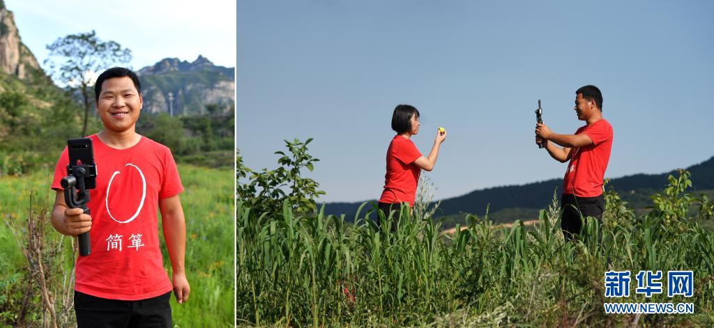 拼版照片:左圖為劉瑞旭拿著手機穩(wěn)定器;右圖為在山西省黎城縣巖井村,劉瑞旭(右)和合作社同事在谷子地里直播(7月8日攝)。今年29歲的劉瑞旭開過飯店、賣過房子、種過果樹,2019年回到老家平順縣榔樹園村做起了職業(yè)農(nóng)民,成為太行山上的“新農(nóng)人”。回村后,劉瑞旭和合作社的同事抓住網(wǎng)絡(luò)直播帶貨的熱潮,嘗試田間地頭直播。借助網(wǎng)絡(luò)的力量,合作社的小米搭上了“互聯(lián)網(wǎng)+”快車銷往全國各地。