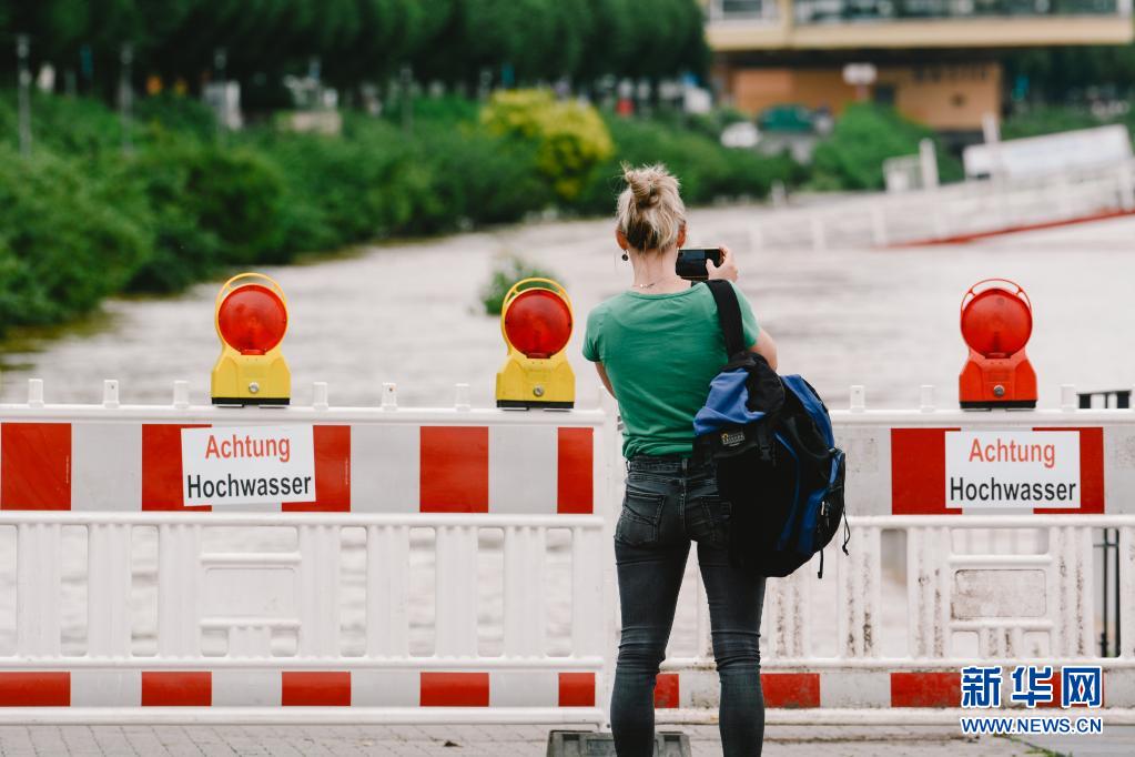 7月15日,在德國(guó)西部城市科隆,一名女子在因水位上漲而封鎖的萊茵河岸邊拍照。