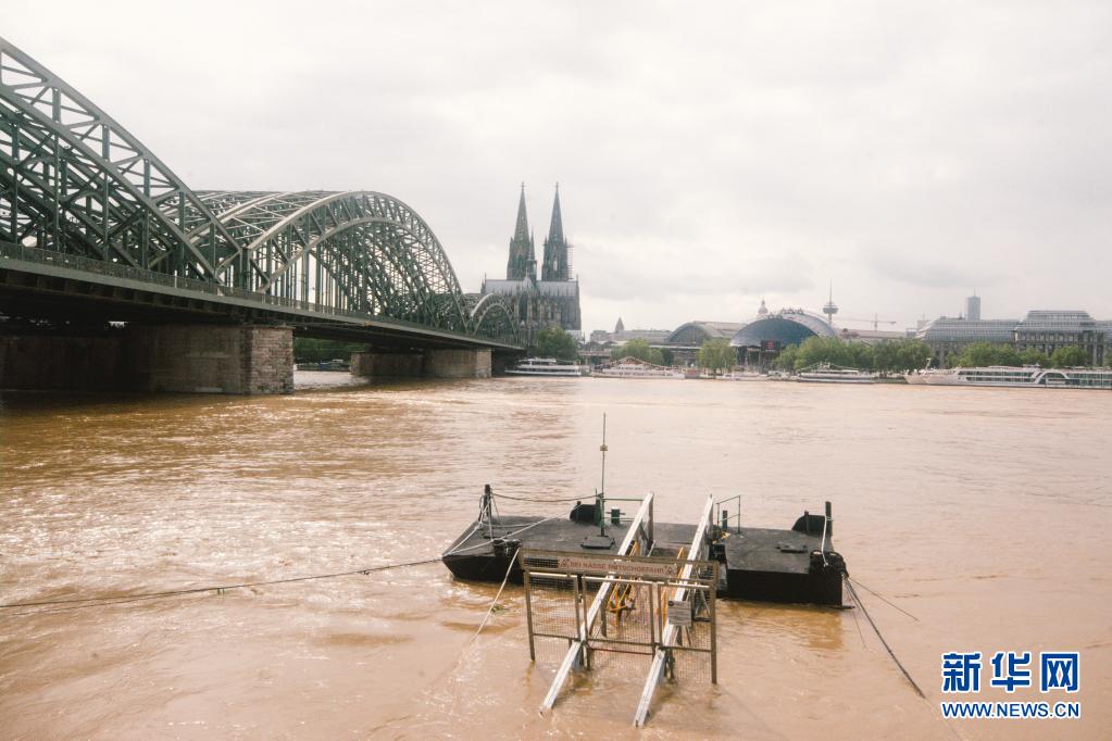 這是7月15日在德國(guó)西部城市科隆拍攝的水位上漲的萊茵河。