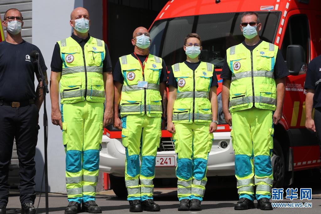 7月20日,救護隊員在比利時南部城市韋爾維耶出席悼念儀式。
