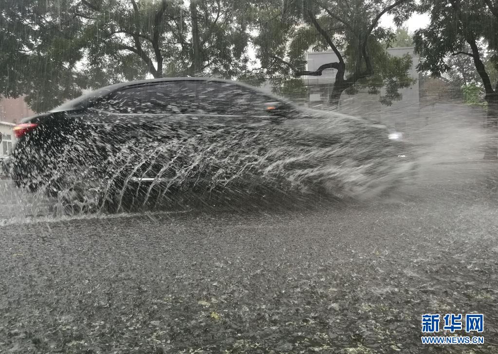 7月27日,在北京西單附近,汽車在雨中前行(手機拍攝)。