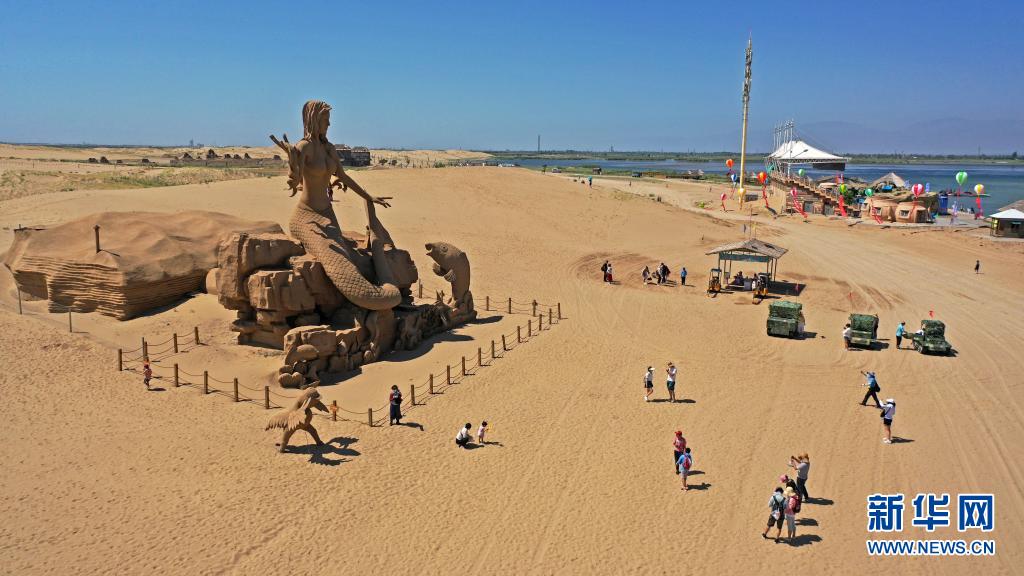 這是7月31日拍攝的寧夏沙湖景區(qū)內(nèi)的巨型沙雕景觀(無(wú)人機(jī)照片)。