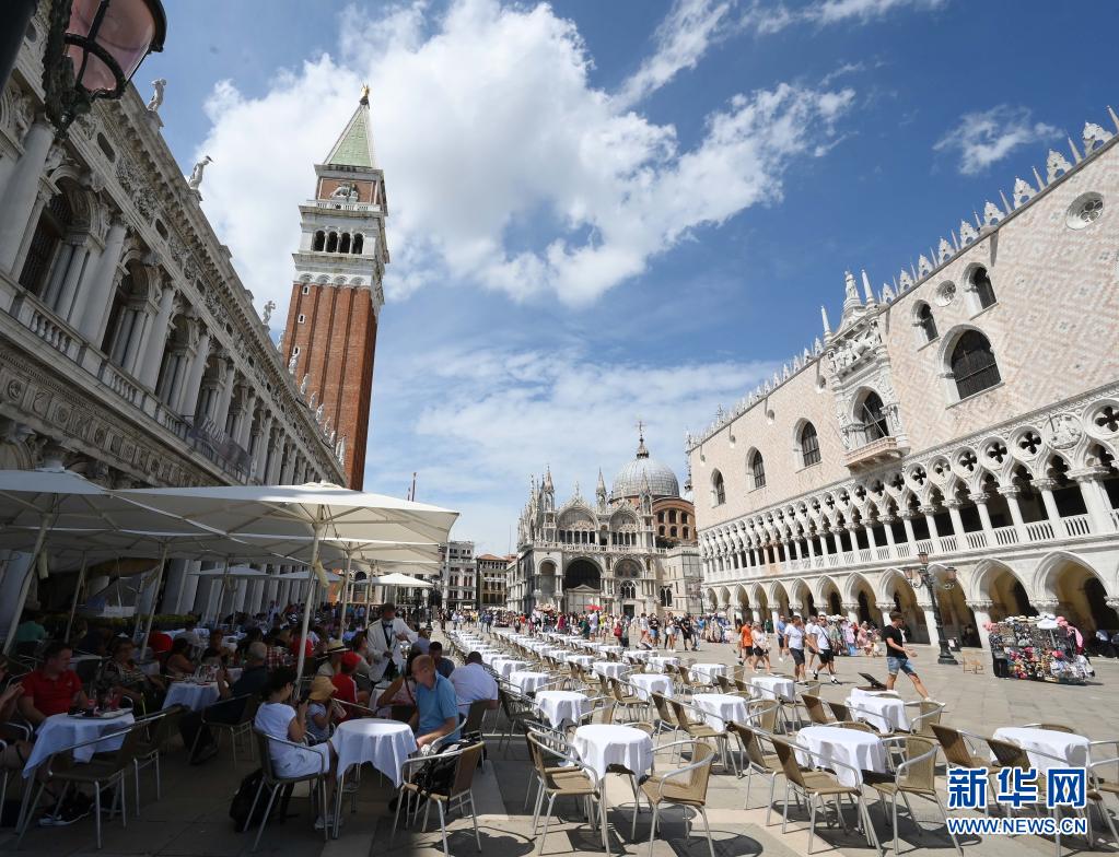 8月3日,游客在意大利威尼斯一處餐廳的戶外就餐區(qū)消費(fèi)。