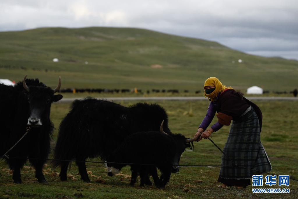 8月3日,在瑪沁縣當(dāng)洛鄉(xiāng)貢龍村的夏季草場上,牧民在拴牦牛。