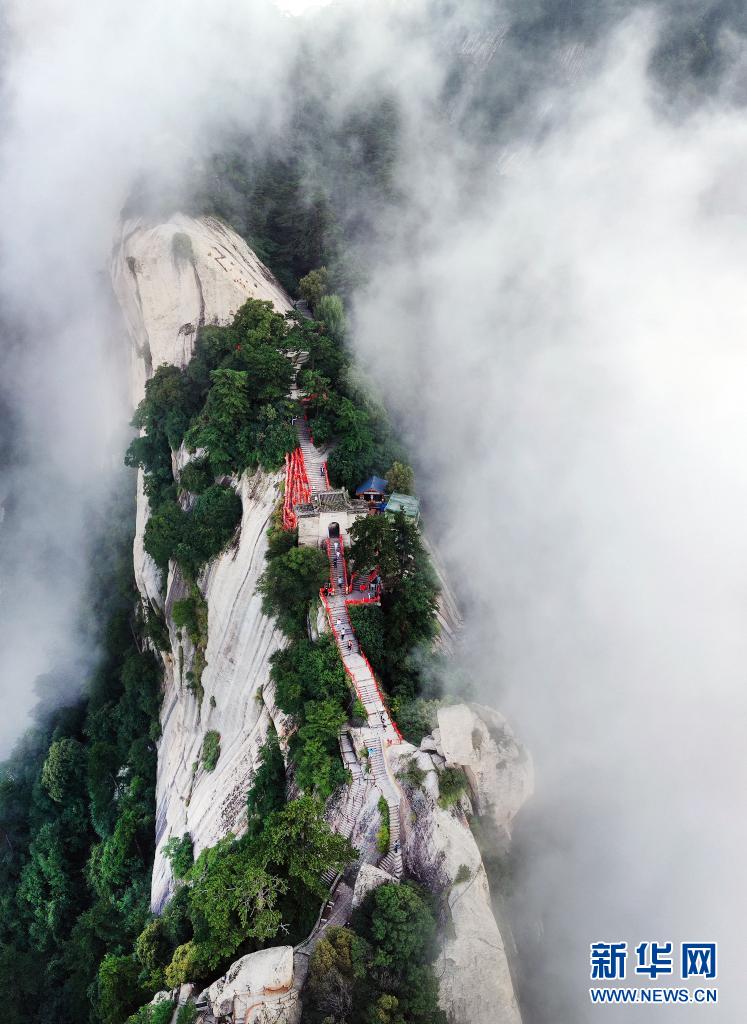 8月14日,云霧中的西岳華山金鎖關(guān)(無人機照片)。
