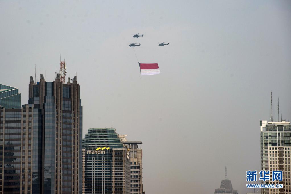 8月17日,懸掛印度尼西亞國旗的直升機(jī)飛過雅加達(dá)上空。8月17日是印度尼西亞獨(dú)立日。新華社發(fā)(維里攝)