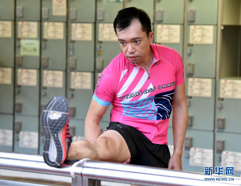猛龍長跑隊(duì)視聽障跑手蔡浩良在訓(xùn)練前熱身(7月29日攝)。新華社記者 盧炳輝 攝