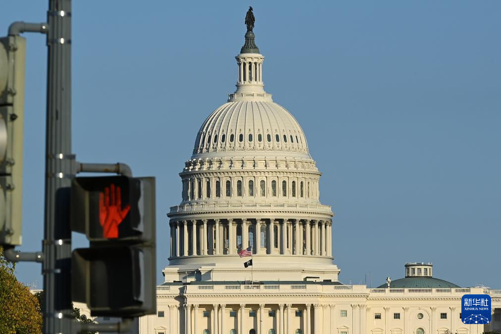 这是10月21日在美国华盛顿拍摄的国会大厦和交通信号灯。