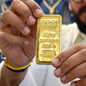 10月23日,在科威特首都科威特城,一名男子在金店内展示500克的金条。