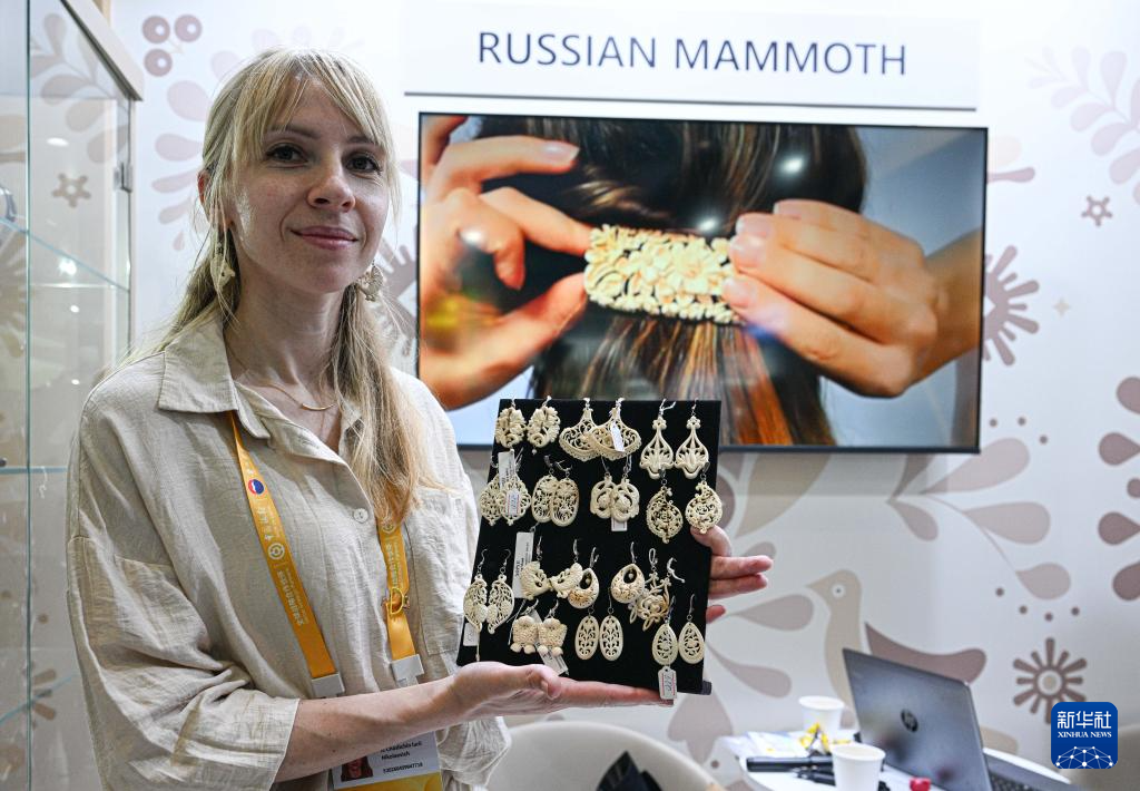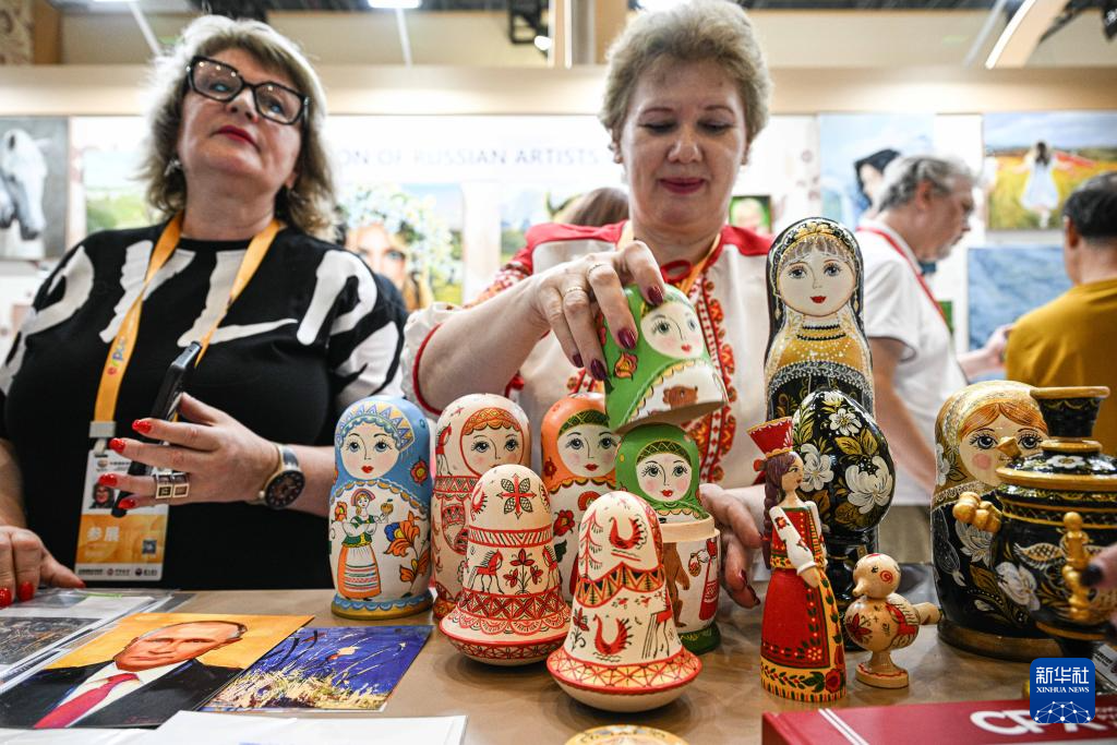 4月16日,参展商在第六届消博会现场展示俄罗斯工艺品。