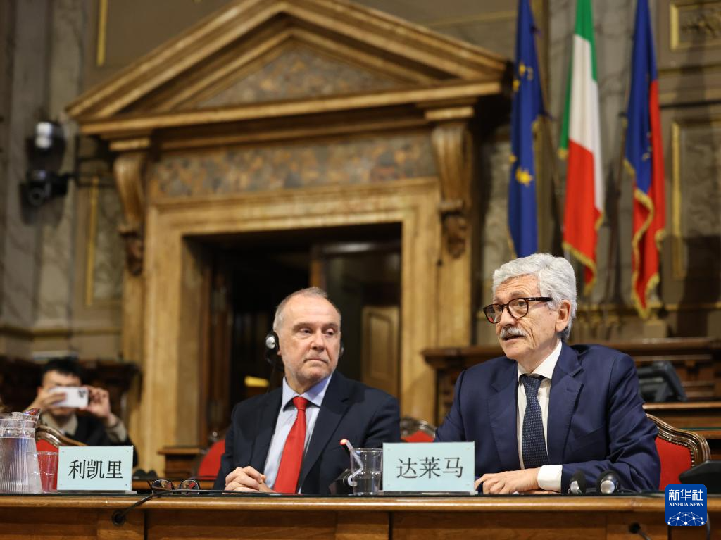 4月16日,在意大利罗马,意前总理达莱马(右一)在第四届中意友城合作对话会上致辞。