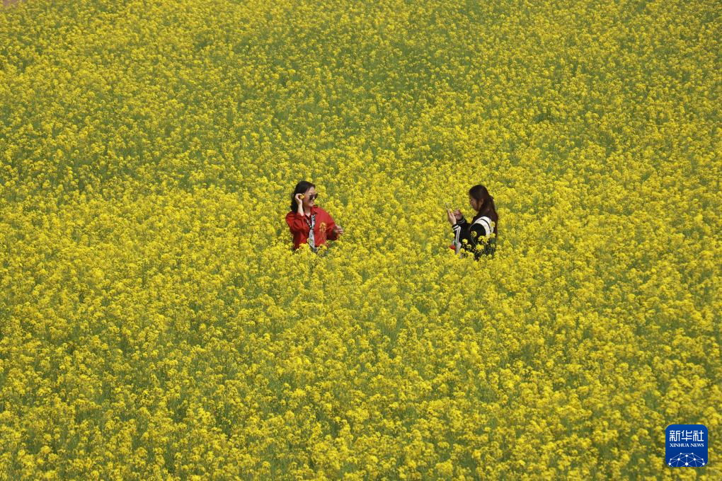 4月17日,游客在河南省安阳市内黄县亳城镇油菜花田拍照。
