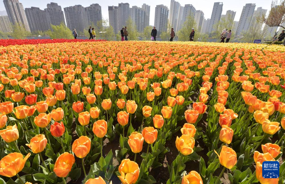 4月18日,在甘肃省兰州市城关区新港城小区内,居民带着孩子赏花休闲。