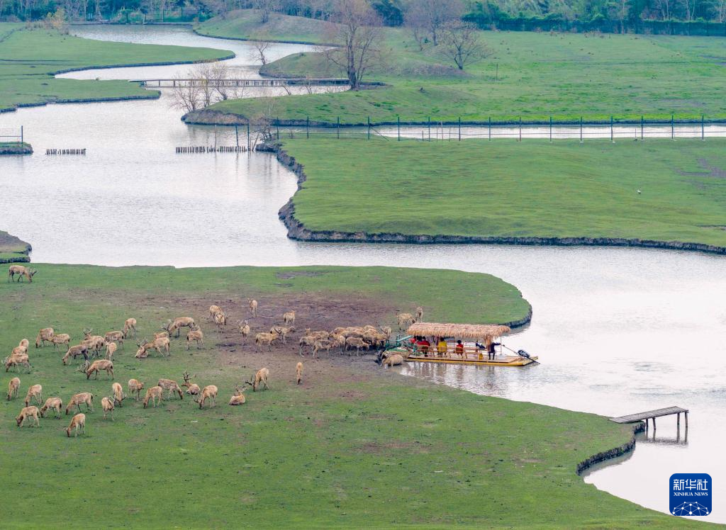 4月17日,在江苏省泰州市姜堰区溱湖国家湿地公园,游客乘坐木筏和麋鹿近距离互动(无人机照片)。