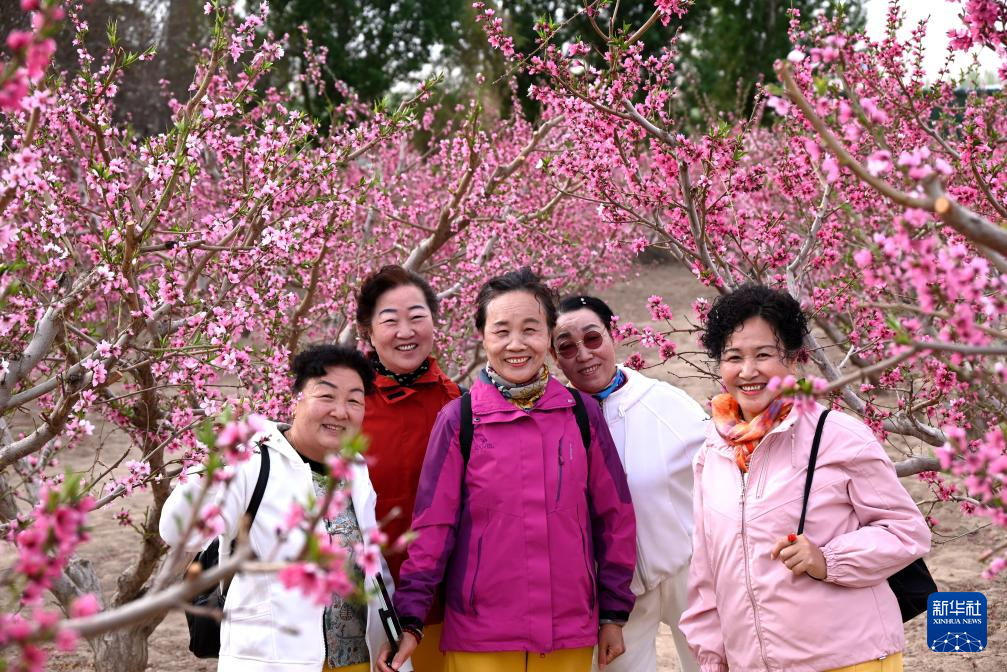 4月18日,游人在甘肃省敦煌市七里镇桃产业示范基地游玩。