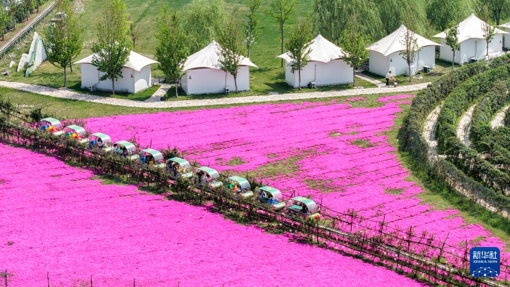 4月18日,在河北省石家庄市灵寿县锦绣大明川露营地,游客乘坐观光小火车赏花游玩。
