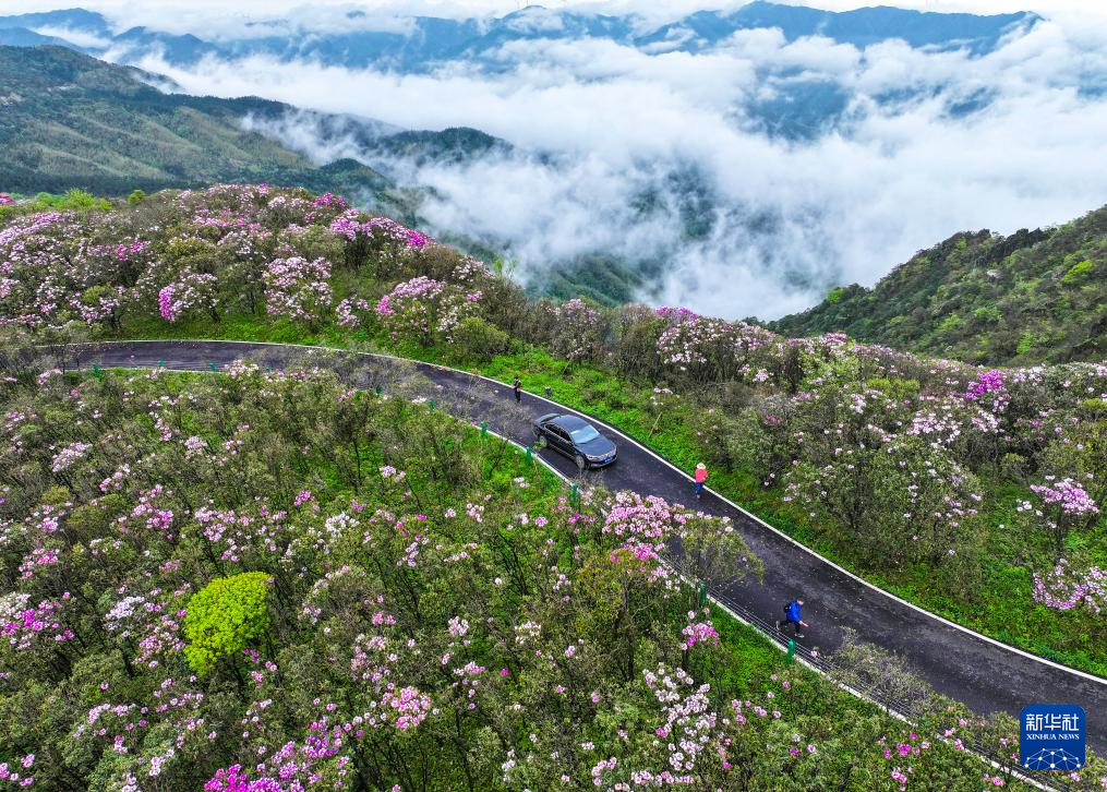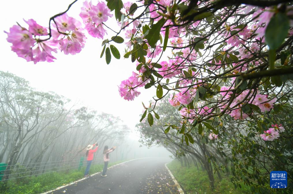 4月17日,游客在湖南省永州市双牌县阳明山国家森林公园杜鹃花海赏花拍照。