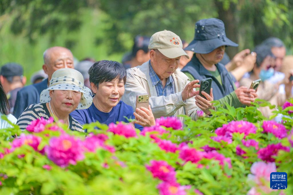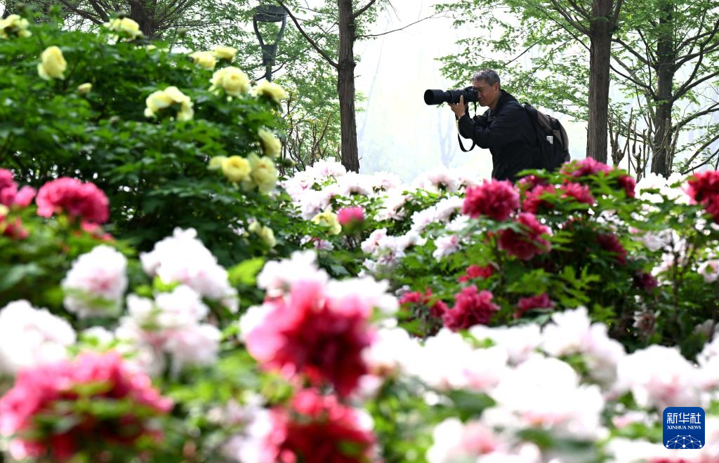 4月18日,摄影爱好者在河北省石家庄市植物园牡丹园拍照。