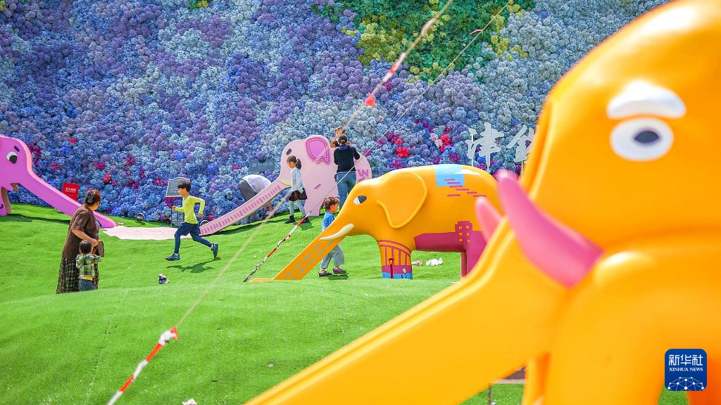 4月18日,市民在天津市河东区的“大象滑梯公园”打卡体验。