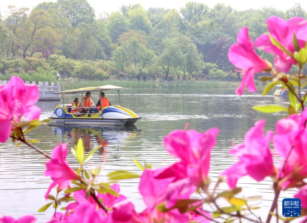 4月18日,游人在湖北省武汉市青山公园乘船赏花游览。