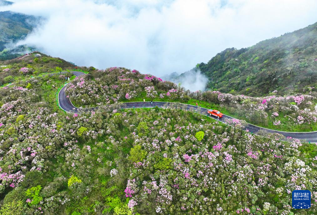 4月17日,游客在湖南省永州市双牌县阳明山国家森林公园杜鹃花海赏花游玩(无人机照片)。