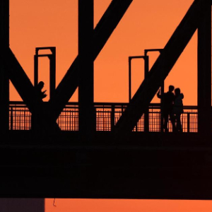 4月11日傍晚,霞光满天,一对情侣在哈尔滨百年滨洲铁路桥上自拍合影。