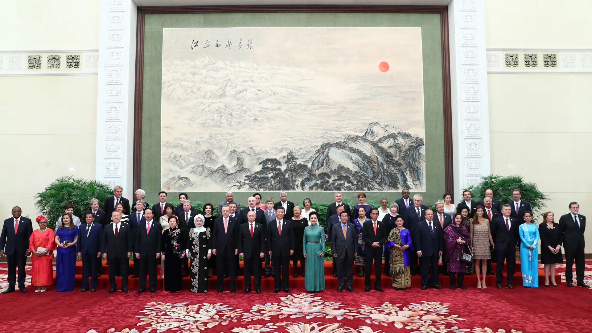 5月14日,國(guó)家主席習(xí)近平在北京人民大會(huì)堂舉行宴會(huì),歡迎出席“一帶一路”國(guó)際合作高峰論壇的外方代表團(tuán)團(tuán)長(zhǎng)及嘉賓。這是習(xí)近平和夫人彭麗媛同外方代表團(tuán)團(tuán)長(zhǎng)及配偶集體合影留念。新華社記者 謝環(huán)馳 攝