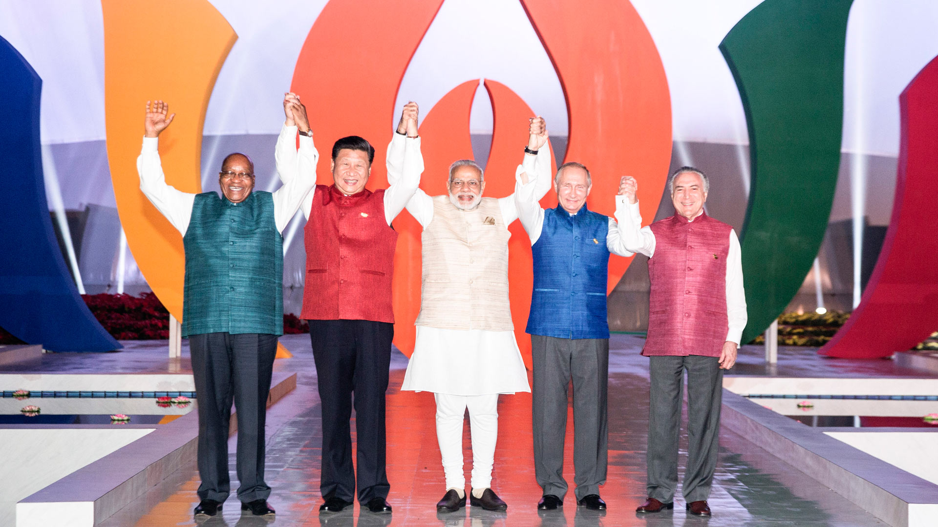 10月16日,金磚國家領導人第八次會晤在印度果阿舉行。中國國家主席習近平、印度總理莫迪、南非總統(tǒng)祖馬、巴西總統(tǒng)特梅爾、俄羅斯總統(tǒng)普京出席。這是5國領導人合影。新華社記者 謝環(huán)馳 攝