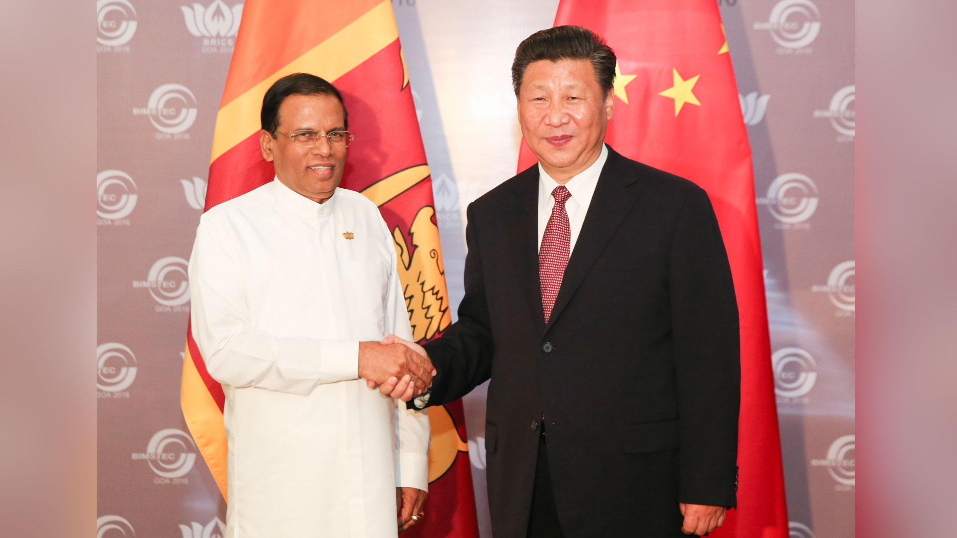 10月16日,國家主席習近平在印度果阿會見斯里蘭卡總統(tǒng)西里塞納。 新華社記者 丁林 攝
