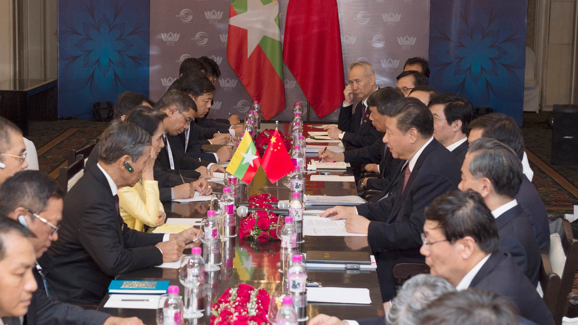 10月16日,國家主席習近平在印度果阿會見緬甸國務資政昂山素季。 新華社記者 王曄 攝