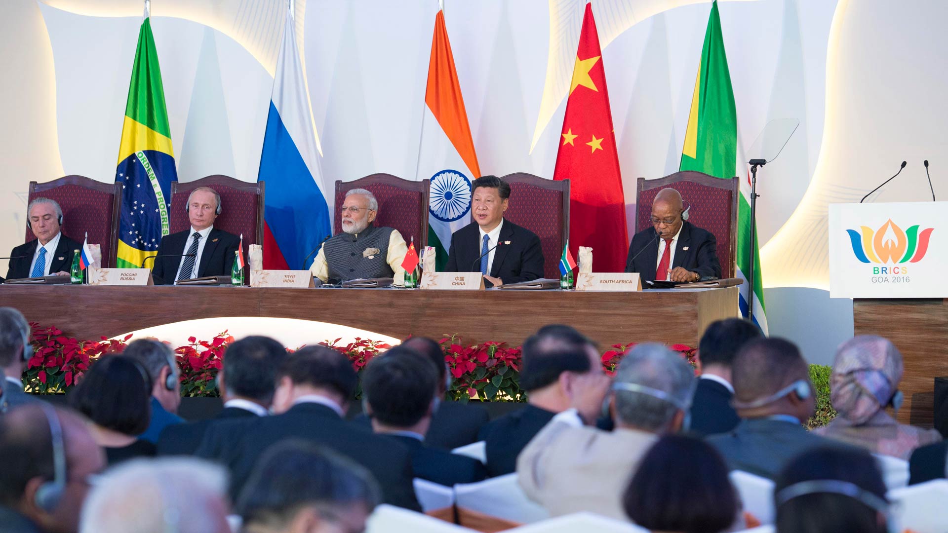 10月16日,金磚國家領導人第八次會晤在印度果阿舉行。中國國家主席習近平、印度總理莫迪、南非總統(tǒng)祖馬、巴西總統(tǒng)特梅爾、俄羅斯總統(tǒng)普京出席。習近平發(fā)表題為《堅定信心 共謀發(fā)展》的重要講話。新華社記者 姚大偉 攝