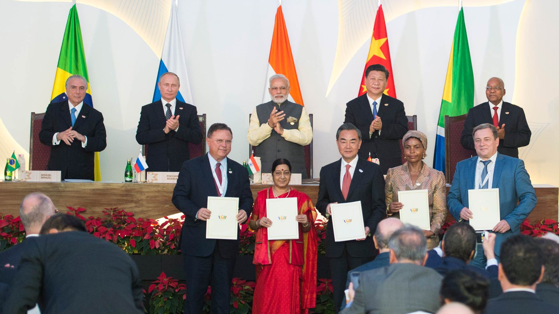 10月16日,金磚國家領導人第八次會晤在印度果阿舉行。中國國家主席習近平、印度總理莫迪、南非總統(tǒng)祖馬、巴西總統(tǒng)特梅爾、俄羅斯總統(tǒng)普京出席。這是會晤結束后,5國領導人共同見證合作文件的簽署,并出席聯(lián)合記者會。新華社記者 謝環(huán)馳 攝