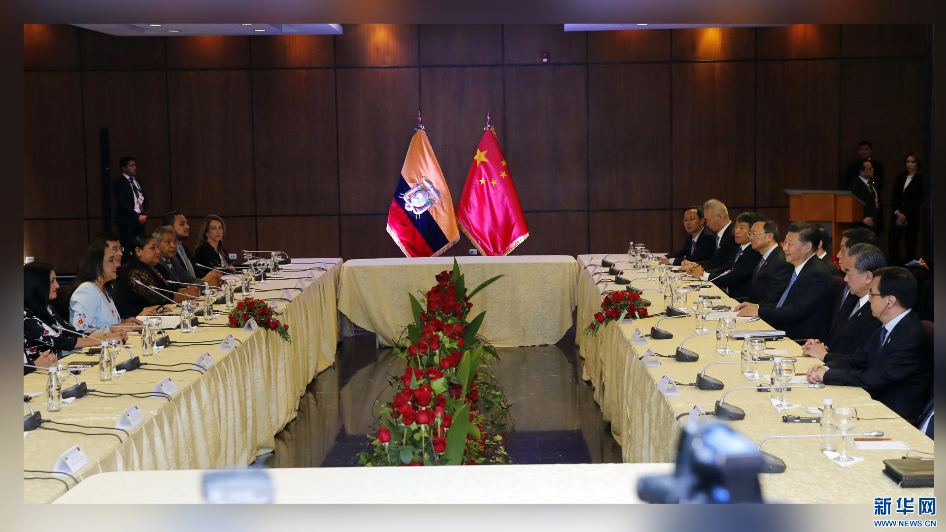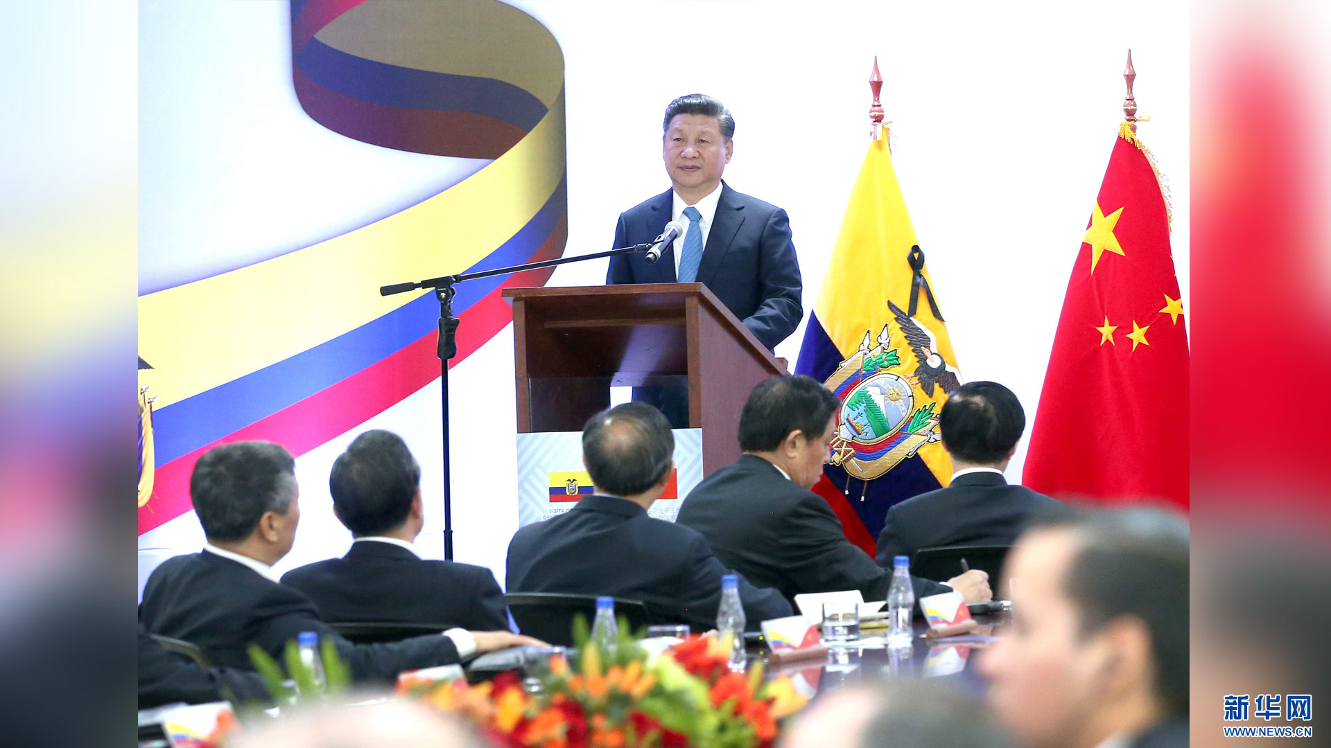 當(dāng)?shù)貢r(shí)間11月18日,國(guó)家主席習(xí)近平在基多同厄瓜多爾總統(tǒng)科雷亞共同出席中方援建的厄瓜多爾公共安全應(yīng)急指揮中心聯(lián)合實(shí)驗(yàn)室揭牌儀式,喬內(nèi)醫(yī)院奠基、科卡科多-辛克雷水電站竣工發(fā)電視頻連線活動(dòng)。這是習(xí)近平出席活動(dòng)后致辭。新華社記者 馬占成 攝2016-11-19