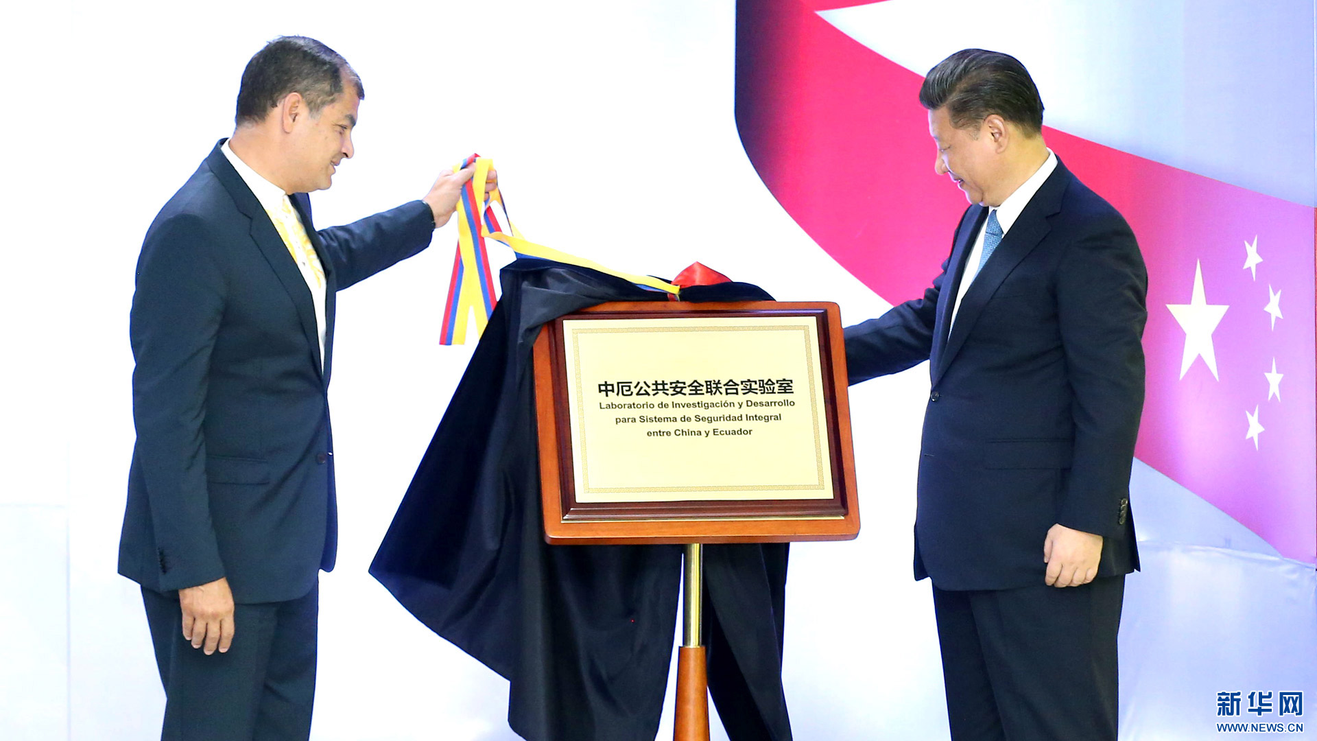 當(dāng)?shù)貢r(shí)間11月18日,國(guó)家主席習(xí)近平在基多同厄瓜多爾總統(tǒng)科雷亞共同出席中方援建的厄瓜多爾公共安全應(yīng)急指揮中心聯(lián)合實(shí)驗(yàn)室揭牌儀式,喬內(nèi)醫(yī)院奠基、科卡科多-辛克雷水電站竣工發(fā)電視頻連線活動(dòng)。這是兩國(guó)元首共同為厄瓜多爾公共安全應(yīng)急指揮中心聯(lián)合實(shí)驗(yàn)室揭牌。新華社記者 馬占成 攝2016-11-19
