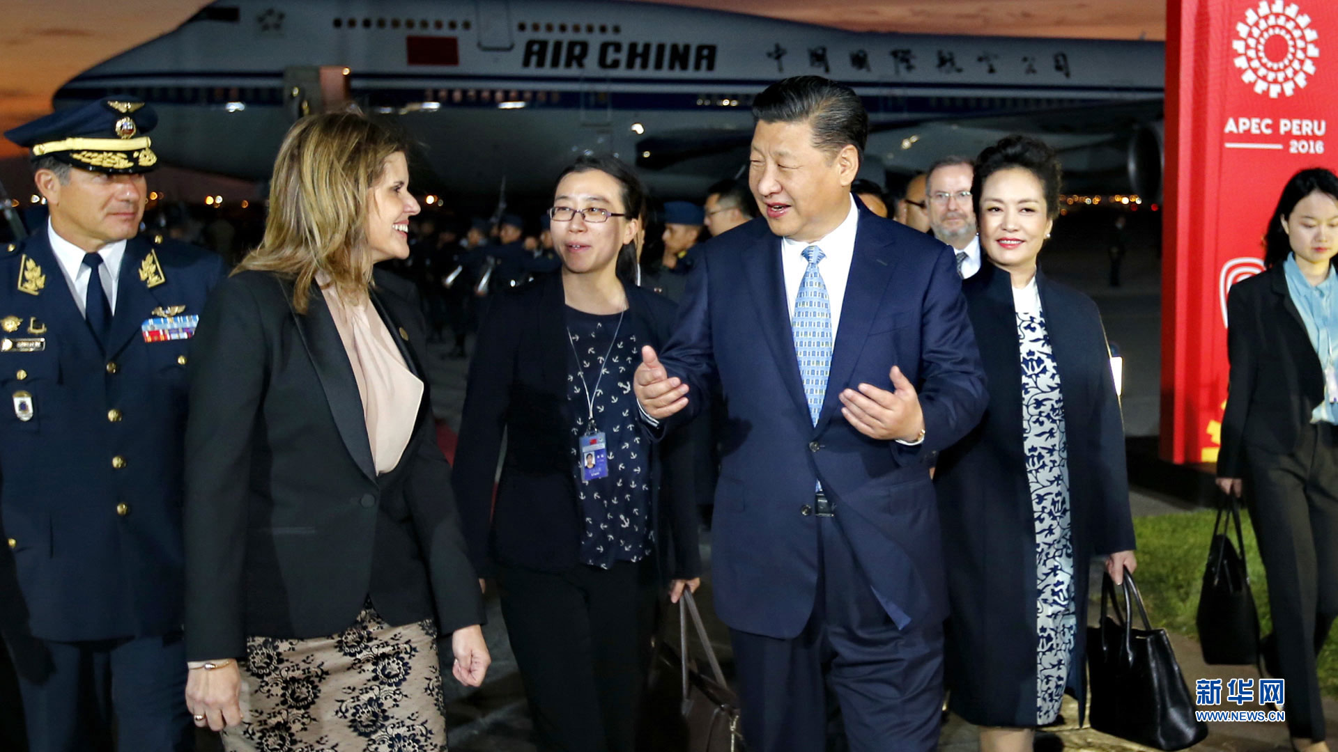 當(dāng)?shù)貢r(shí)間11月18日,國(guó)家主席習(xí)近平抵達(dá)利馬,出席亞太經(jīng)合組織第二十四次領(lǐng)導(dǎo)人非正式會(huì)議并對(duì)秘魯共和國(guó)進(jìn)行國(guó)事訪問(wèn)。習(xí)近平和夫人彭麗媛受到秘魯副總統(tǒng)阿勞斯等熱情迎接。新華社記者 丁林 攝2016-11-20
