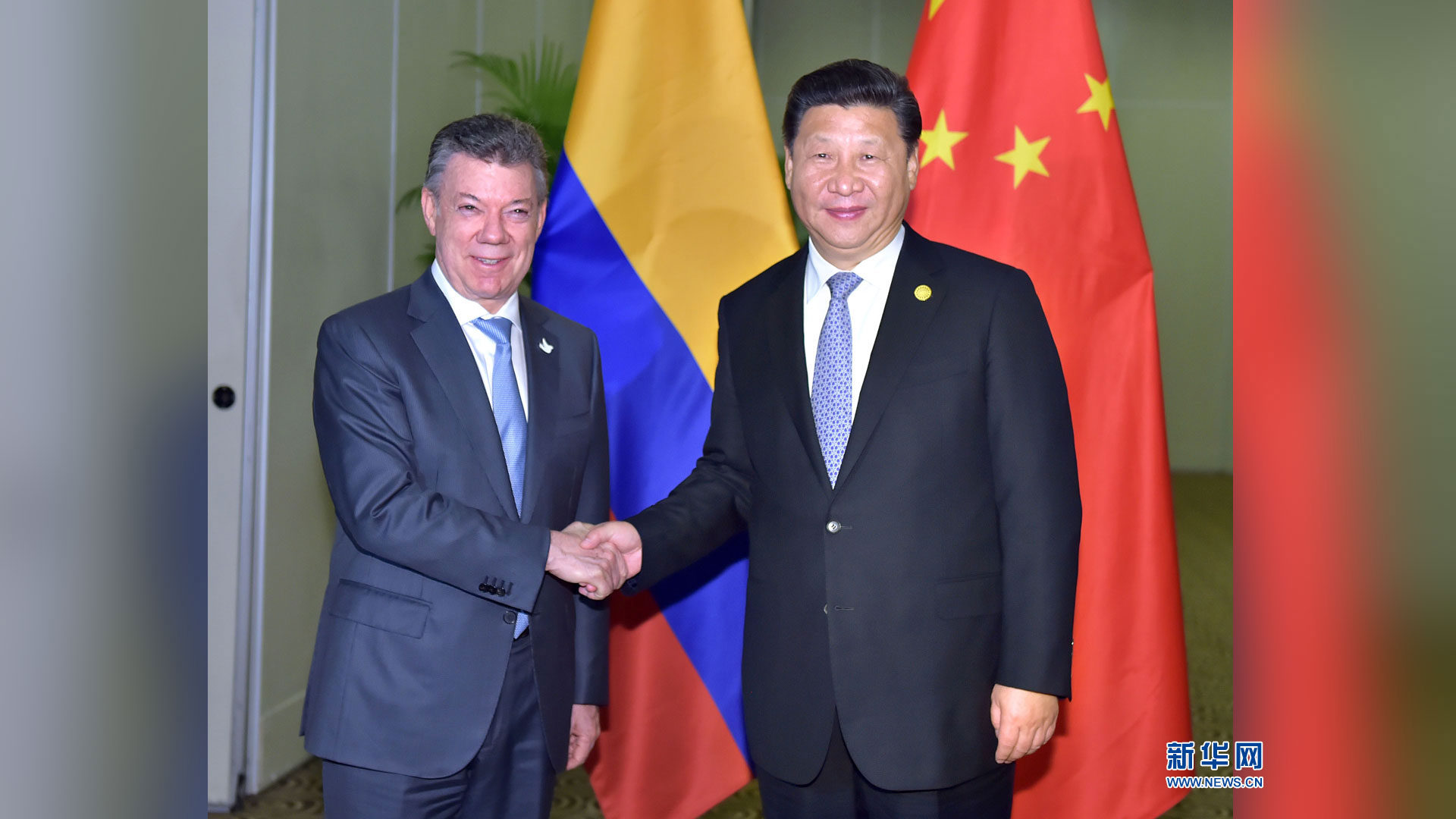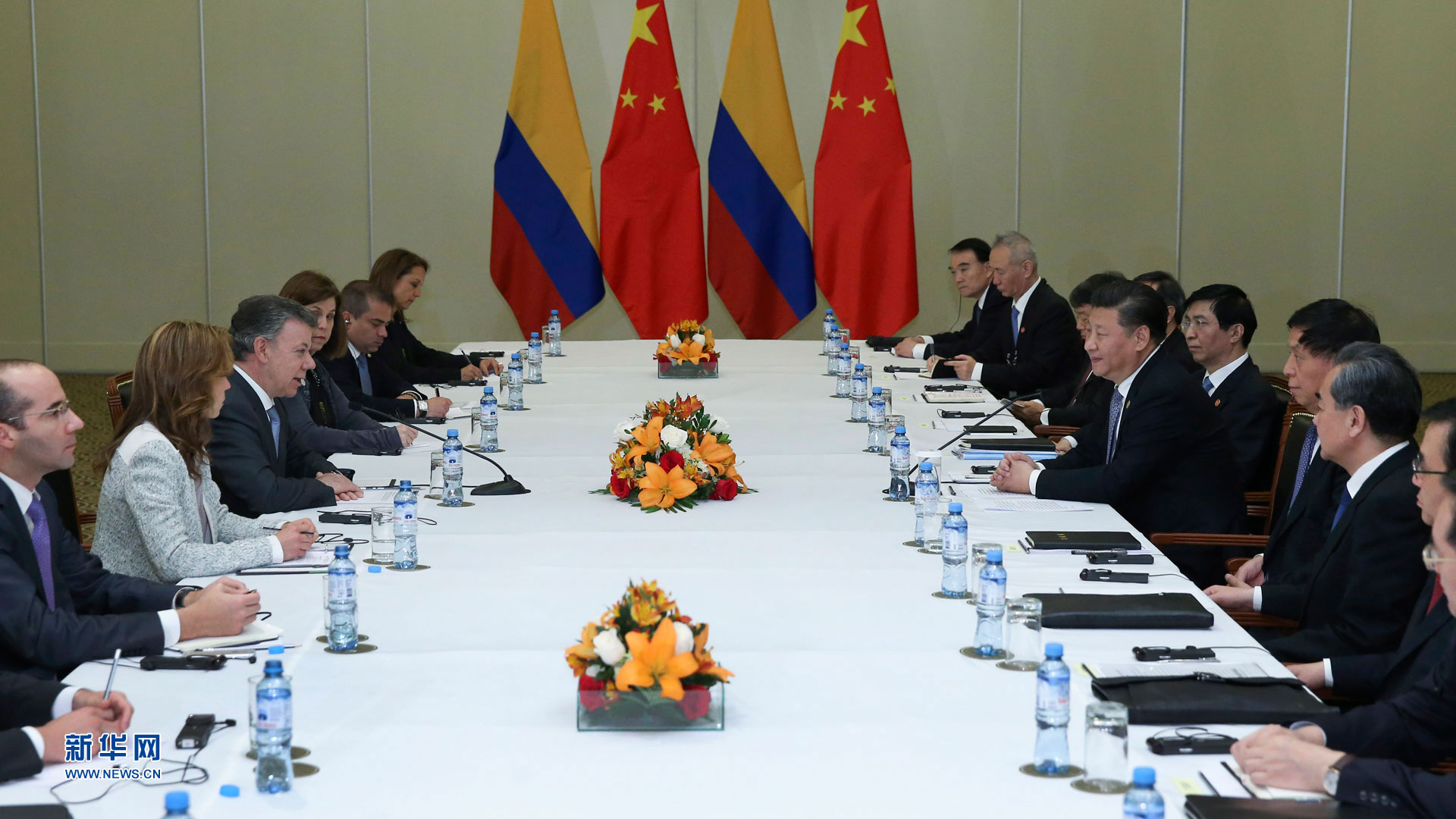 11月19日,國(guó)家主席習(xí)近平在利馬會(huì)見(jiàn)哥倫比亞總統(tǒng)桑托斯。新華社記者 龐興雷 攝2016-11-20