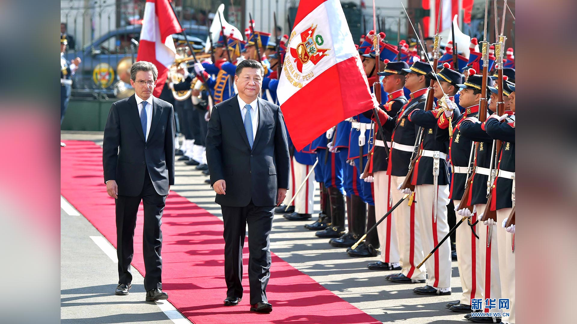 11月21日,國(guó)家主席習(xí)近平在利馬同秘魯總統(tǒng)庫(kù)琴斯基舉行會(huì)談。會(huì)談前,習(xí)近平出席庫(kù)琴斯基在總統(tǒng)府前廣場(chǎng)舉行的歡迎儀式。 新華社記者李濤 攝2016-11-23