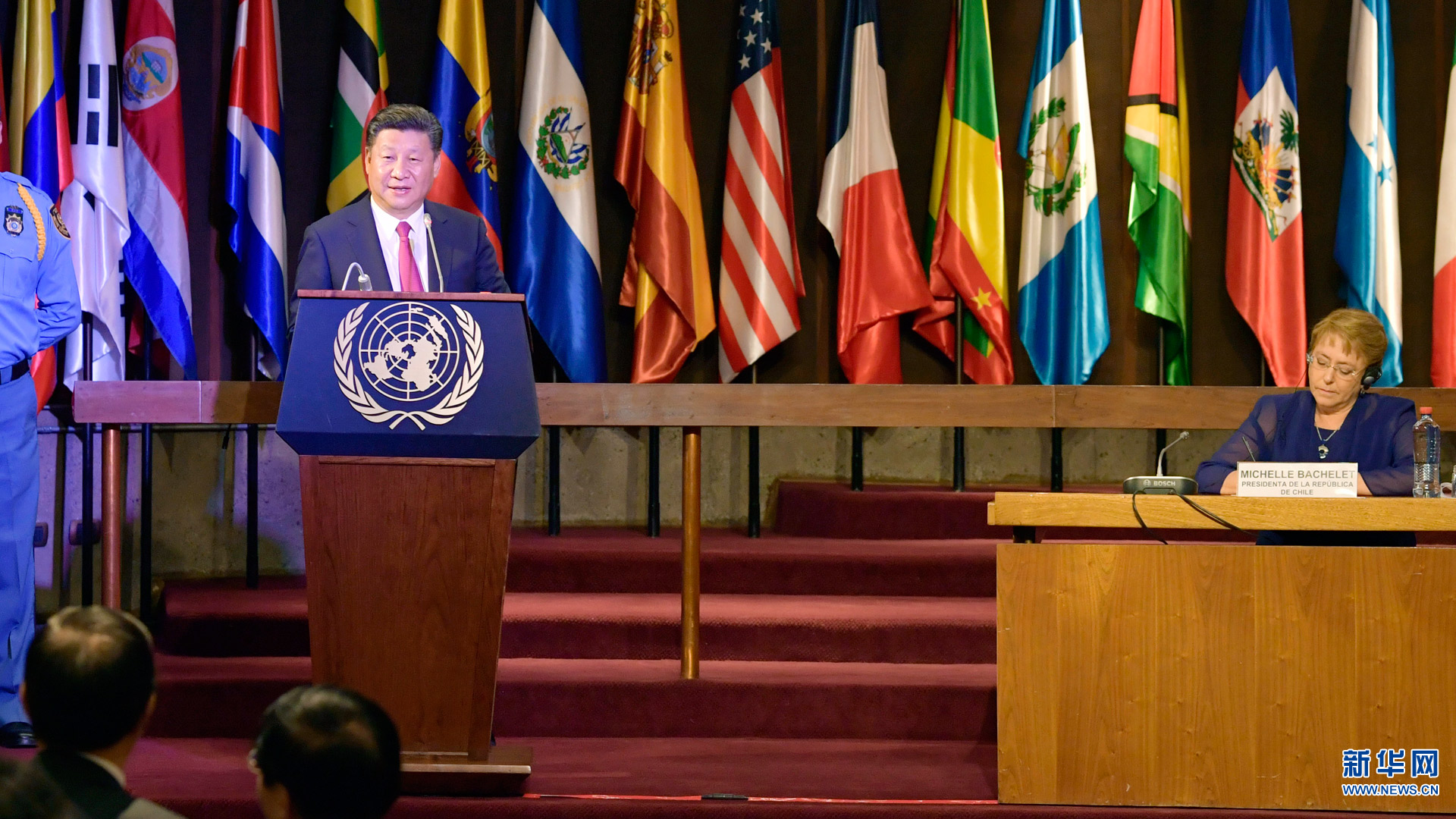 11月22日,國(guó)家主席習(xí)近平在圣地亞哥聯(lián)合國(guó)拉丁美洲和加勒比經(jīng)濟(jì)委員會(huì)總部出席中拉媒體領(lǐng)袖峰會(huì)開(kāi)幕式。智利總統(tǒng)巴切萊特陪同出席。在熱烈的掌聲中,習(xí)近平發(fā)表題為《開(kāi)創(chuàng)中拉媒體合作新局面》的致辭。新華社記者 王曄 攝2016-11-23